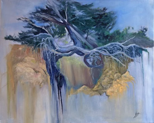 Situated on Clayloch Beach on the Olympic Peninsula in Washington, this tree is a tourist attraction. It sits between two cliff sides, the roots hanging on the sides and the rest falling beneath in empty space. When the sun is behind the tree, it is quite spectacular. This is a contemporary rendition but the tree remains realistic as nothing can quite describe it as well as reality. To see an image of the framed piece, email me.
